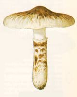 Kalapja elefántcsontfehér alapon rásimuló sárga, gesztenyebarna pikkelyekkel gyapjasan szálasan hasadozó. Tönkje fehér, barnán, szálasan pikkelyes, gallérja fehér. Körte- vagy galagonyaillatú. Többnyire egyesével fenyvesben (fôként erdei fenyô alatt) terem ôsszel. A matsu-take (matsu = erdei fenyô, take = gomba) Japánban a legkedveltebb étkezési gomba. Nagyon gyakori Japán erdei fenyveseiben, nagy mennyiségben gyûjtik és szárítva vagy füstölve árusítják. |